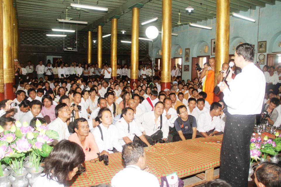 ခ်မ္းျမသာစည္ၿမိဳ႕နယ္၊ အလယ္တိုက္ႀကီး၊ ဒကိၡဏာရာမဘုရားႀကီးေက်ာင္းတ ိုက္တြင္ ဆက္လက္က်င္းပရာ ႏိုင္ငံေရးေဆြးေႏြးမႈမ်ားကို၈၈မ်ဳိးဆက္ေက်ာင္းသားေခါင္းေဆာင္ မင္းကိုႏိုင္မွ ေဆြးေႏြးစဥ္။
